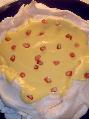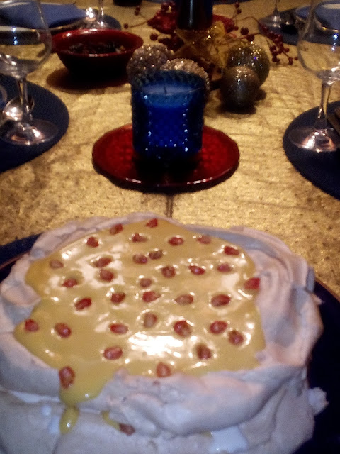 Na minha Ceia de Reis, este ano, o tradicional bolo rei foi destronado por esta pavlova caseirinha e decorada com os bagos de romã, que, segundo a tradição, se deverá comer nessa noite e guardar alguns bagos na carteira de modo a garantirmos dinheiro e fartura para o ano inteiro.