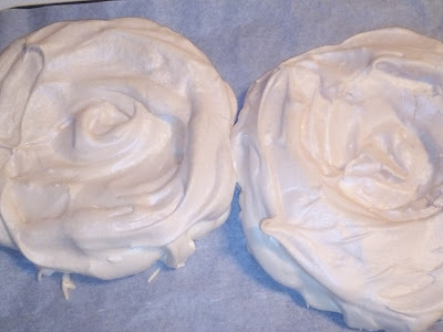 açúcar gradualmente e sem parar de bater. Adicione a Maizena e bata. Junte o vinagre e continue a bater. Coloque uma folha de papel vegetal em cima do tabuleiro que vai ao forno e divida o preparado em dois círculos, espalhando com uma colher.